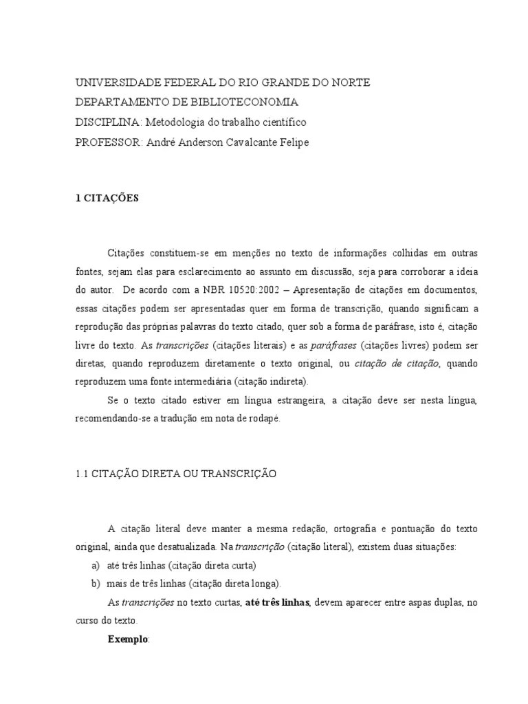 É a transcrição literal de um texto... Em linhas gerais, é a transcrição de uma ideia no formato de citação direta. Quando o tamanho não passa das três linhas, a citação deve estar entre aspas duplas. Devido à ausência de aspas, o texto elaborado ficou parecendo uma. May 20, 2014 · citação direta:. Veja um exemplo de apud ou citação de citação: